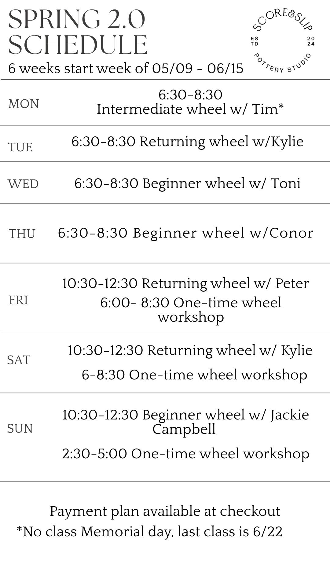 If interested checking out the studio before signing up for a class please email us at hello@scoreandslip.com